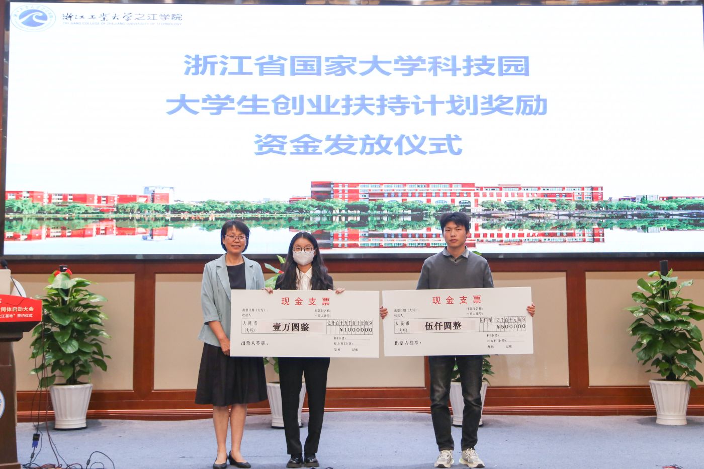 讲座期间,举行了浙江省国家大学科技园大学生创业扶持计划奖励资金发放仪式。两家之江学院大学生创办的在园企业——杭州利阳智能科技有限责任公司、杭州徙木数字科技有限公司获得了科技园的大学生创业扶持奖励资金。