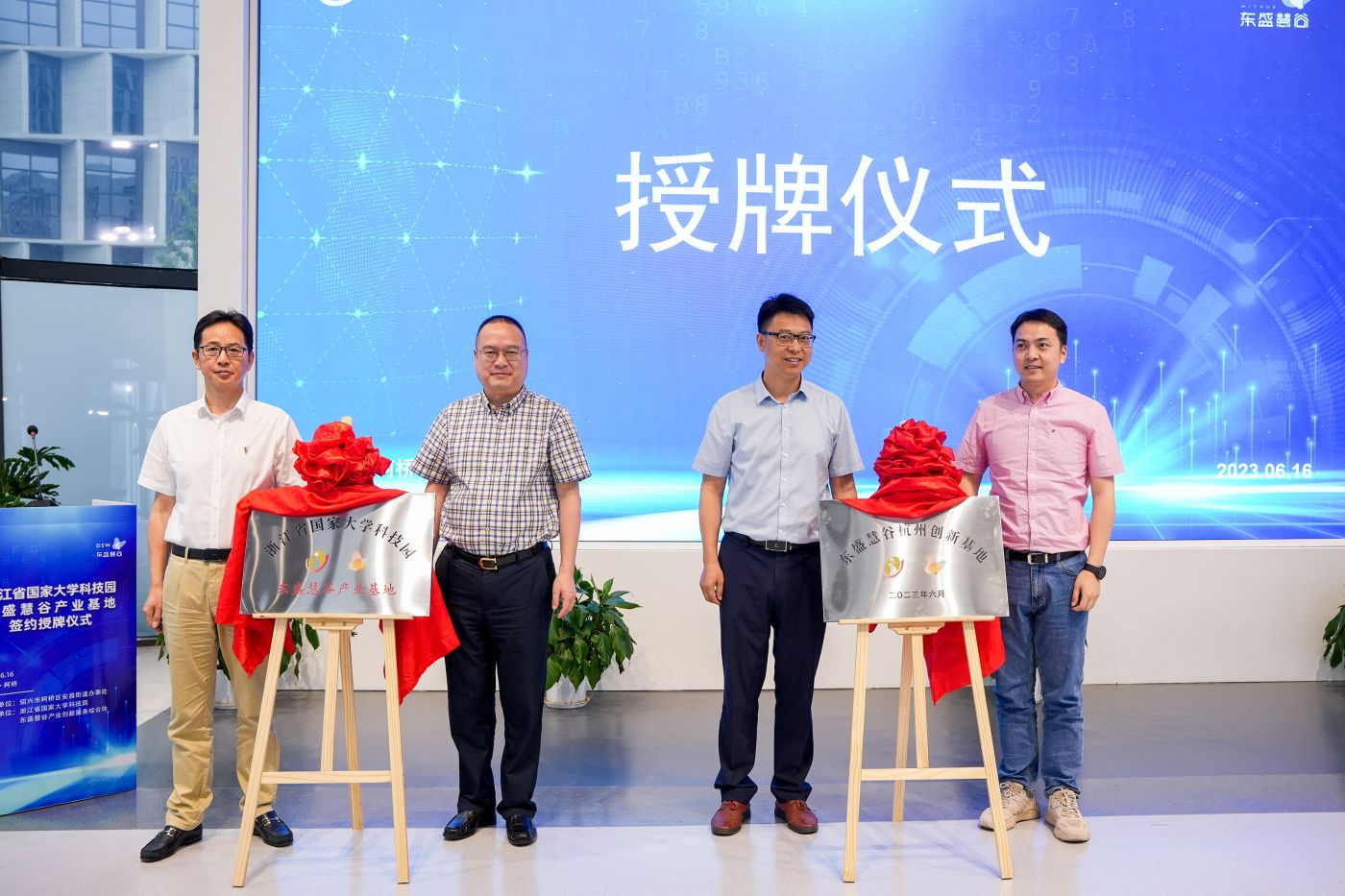 张军、金伟伟、钱佩忠、陈根宝共同为“浙江省国家大学科技园东盛慧谷产业基地”“东盛慧谷杭州创新基地”基地揭牌。