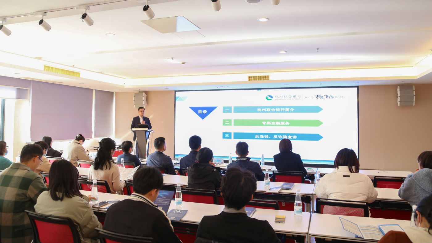 现场,杭州联合银行九堡支行相关负责人就银行情况、专属金融服务、反洗钱、反诈骗等内容作了详细介绍。