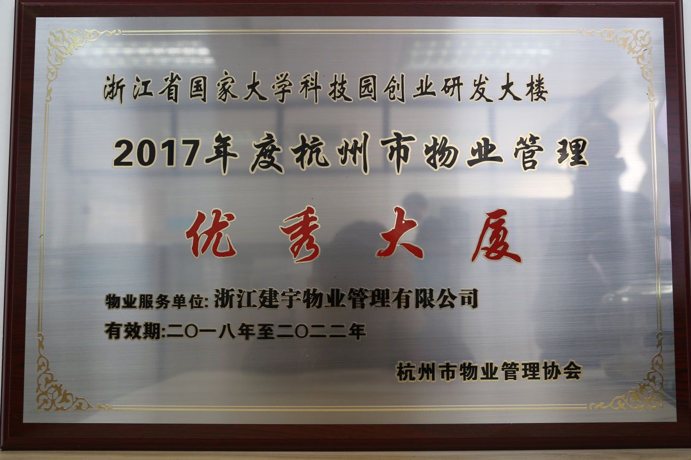 2017年10月,杭州市物业管理协会组织开展了2017年度杭州市物业管理优秀住宅小区(大厦)考评工作。经过物业管理单位自主申报、住建部门推荐、现场检查验收、专家评委评审及媒体公示等环节,最终浙江省国家大学科技园创业研发大楼荣获本年度“杭州市物业管理优秀大厦”荣誉称号。