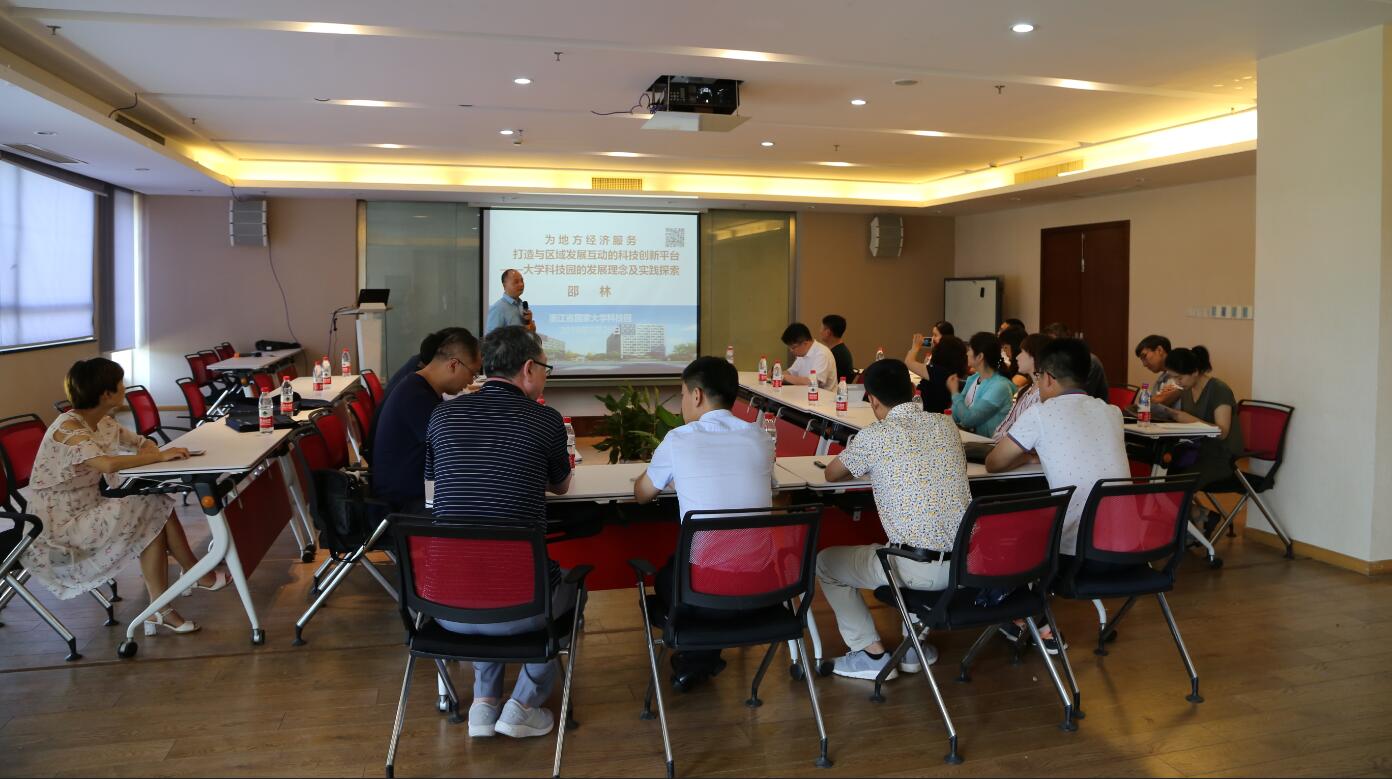 上午,大学科技园总经理邵林在报告厅与学员们分享了《为地方经济服务,打造区域发展的科技创新平台——大学科技园的发展理念及实践探索》专题。他介绍了国家大学科技园的功能和定位、经过十多年建设发展取得的成就以及下一步发展的重点任务。他结合浙江省国家大学科技园发展的实际情况,分享了对大学科技园未来发展的思考。在最后的讨论环节,双方就如何利用高校科技创新资源对地方经济社会发展做出贡献展开了热烈的交流和讨论。