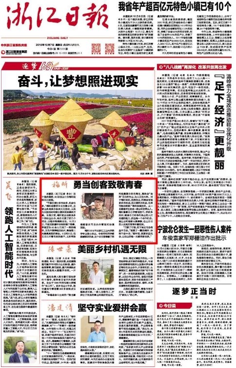 浙江日报一版报道梅昕创业故事