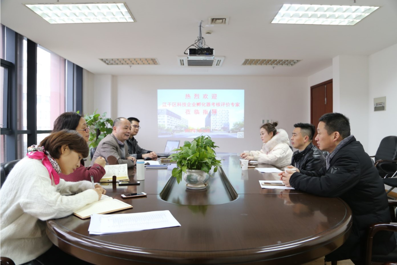 1月16日上午,由江干区科技局副局长陈有文带队的专家组一行3人前来园区开展2018年度市级以上科技企业孵化器考察调研。
