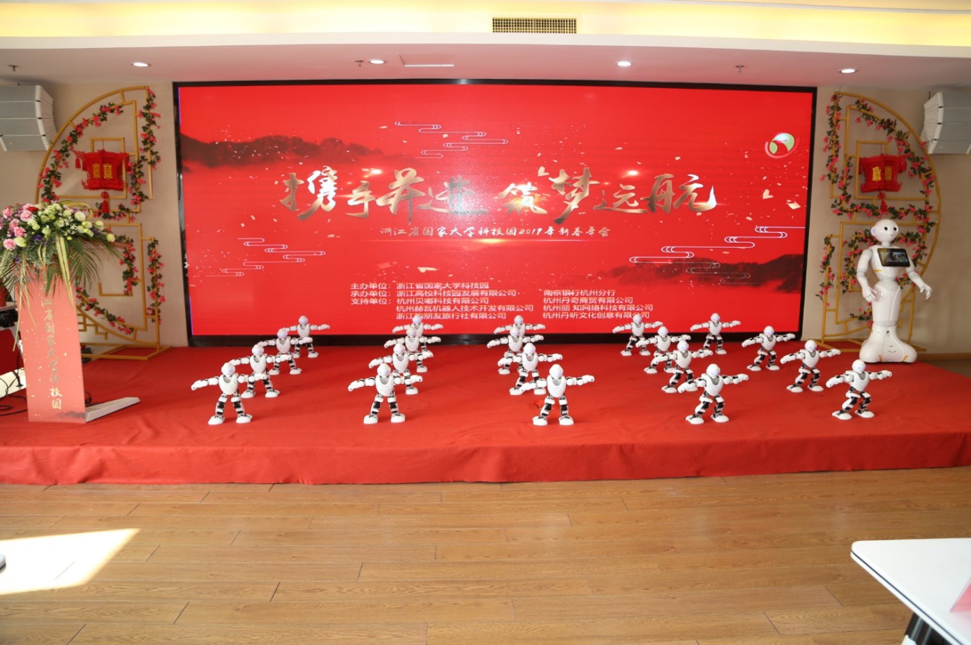 活动正式开始前,由园区企业杭州赫瓦机器人技术开发有限公司带来的机器人们进行了暖场表演。在欢快的音乐下,20个机器人整齐的舞蹈,呆萌的动作,吸引了每一位参会嘉宾的眼光,纷纷举起手机记录下这一美好刻。