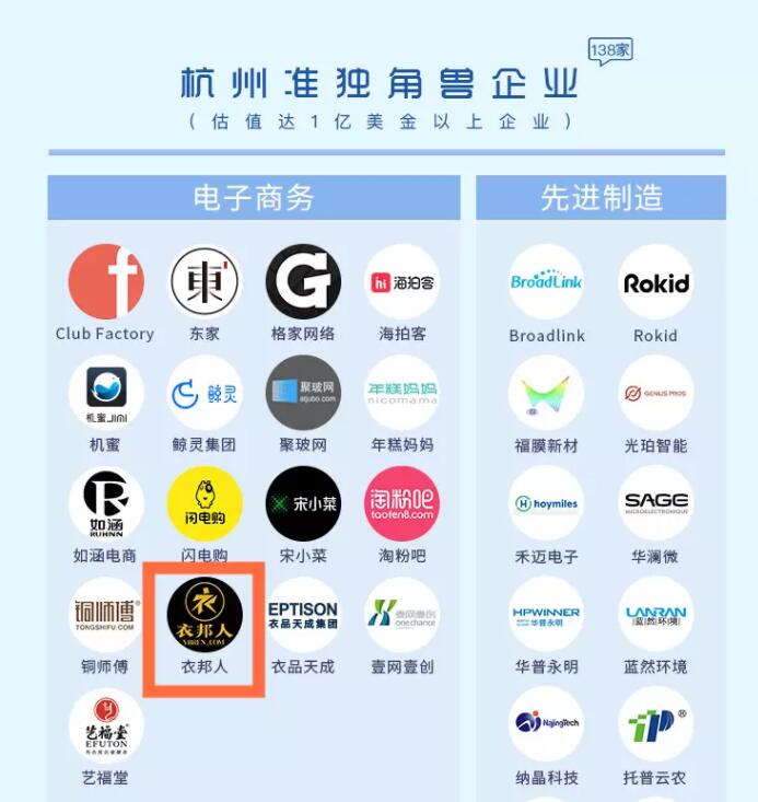3月12日,由杭州市人民政府、中国投资发展促进会共同主办的第三届万物生长大会上,杭州市创业投资协会与微链联合发布《2019杭州独角兽&准独角兽企业榜单》。其中,园区企业杭州贝嘟科技有限公司旗下互联网+服装定制平台衣邦人入选准独角兽企业榜单,也成为获此荣誉的唯一一家服装定制企业。