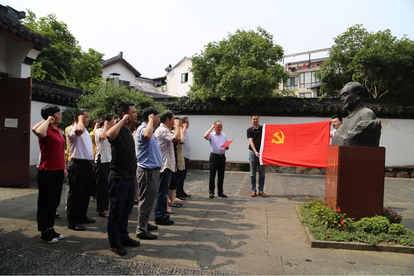 6月27日下午,梅雨暂歇,阳光普照,在中国共产党成立九十八周年、新中国成立七十周年来临之际,大学科技园党支部和浙建实业党总支全体党员来到杭州市西湖区梅家坞211号周恩来纪念室,联合开展“不忘初心、牢记使命”主题教育活动。