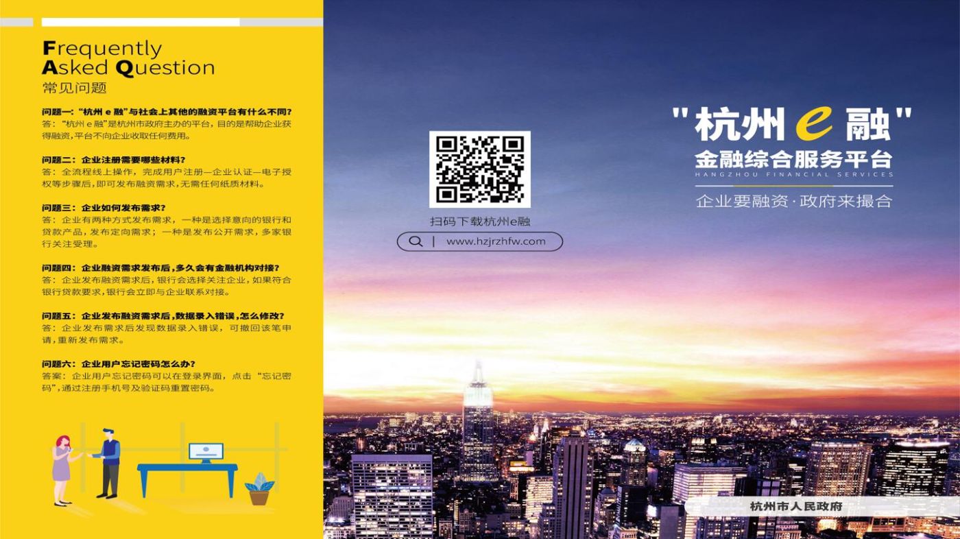 据悉,为大力扶持中小微企业的发展,由杭州市人民政府主办开发的“杭州e融”(杭州金融综合服务平台)网页及APP已于最近建设完成,正式投入使用。园区企业可以自行登录使用 “杭州e融”金融服务平台。