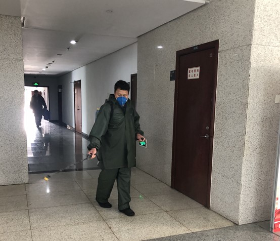 物业管理人员在公共区域消毒