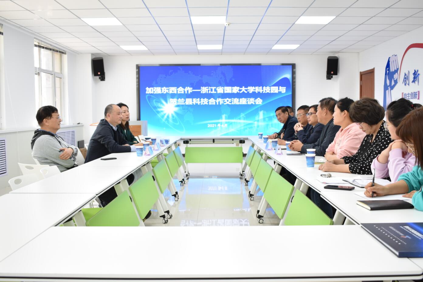 4月21-23日,园区总经理邵林一行赴宁夏回族自治区贺兰县进行科技交流合作活动,并于21日下午在贺兰县科创中心会议室与贺兰县领导召开了加强东西部科技合作座谈会。贺兰县委常委、副县长南晓青、县政协副主席马建民、科技局副局长郑利民、科创中心主任祁伟斌及部分企业代表参加座谈会。