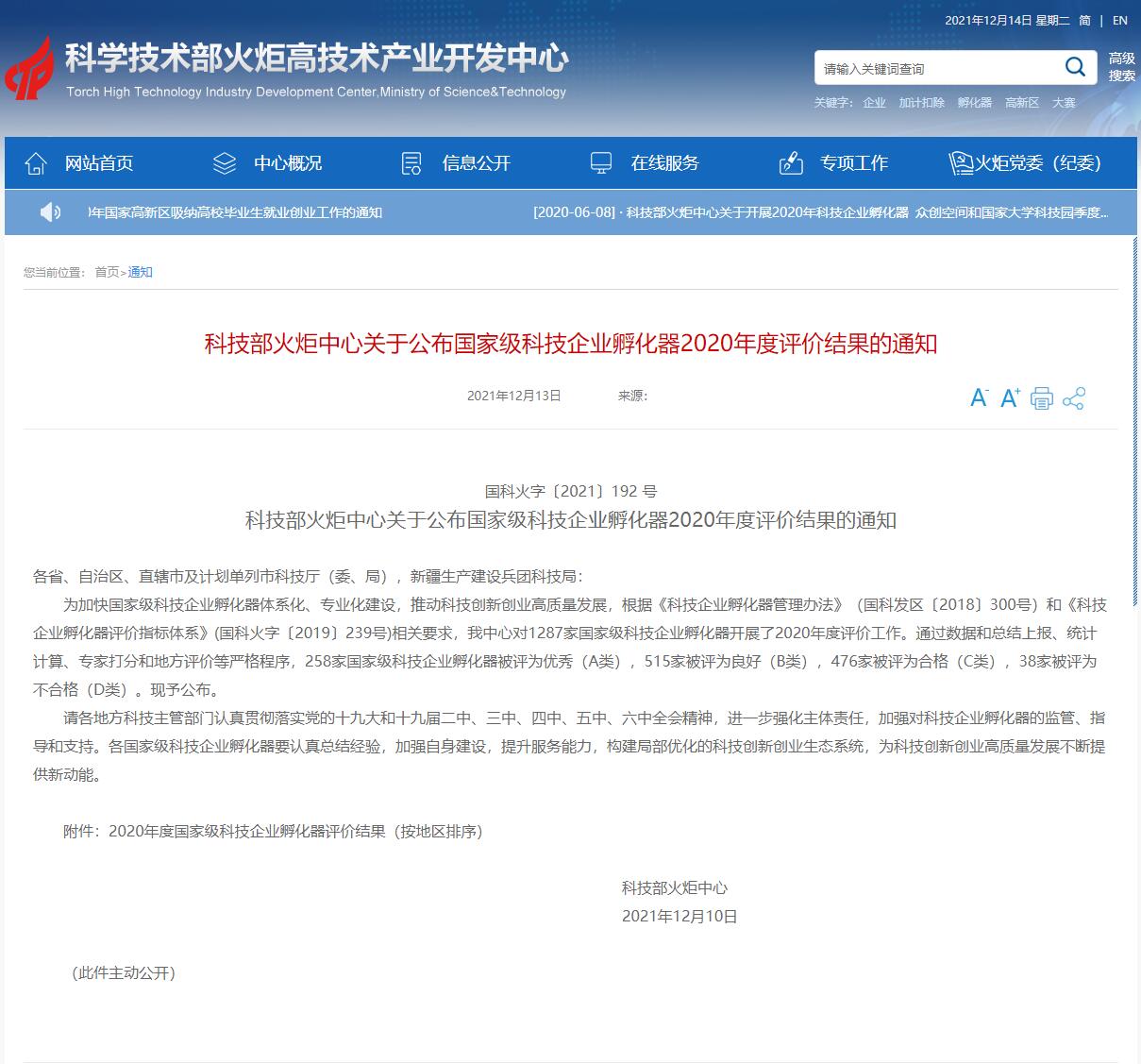 近日,科技部火炬中心关于国家级科技企业孵化器2020年度的评价结果新鲜出炉。通过数据和总结上报、统计计算、专家打分和地方评价等严格程序,园区运作主体浙江高校科技园发展有限公司在全国1287家国家级科技企业孵化器年度评价中,再次荣获国家级科技企业孵化器2020年度评价优秀(A类)的成绩,这是2015年以来科技部火炬中心组织的六次年度评价中,公司第五次取得优秀(A类)的好成绩。
