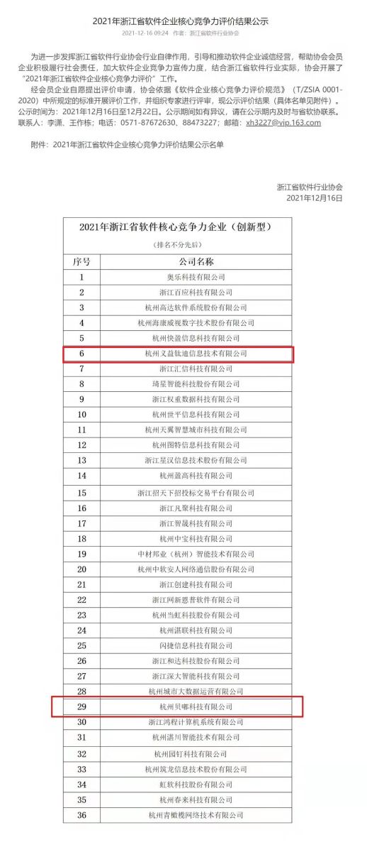 近日,浙江省软件行业协会对外正式公布了2021年浙江省软件企业核心竞争力评价结果公示。园区企业杭州义益钛迪信息技术有限公司和杭州贝嘟科技有限公司成功入选“2021年浙江省软件核心竞争力企业(创新型)”企业名单,体现了公司在浙江省软件企业中的企业实力及核心竞争力。