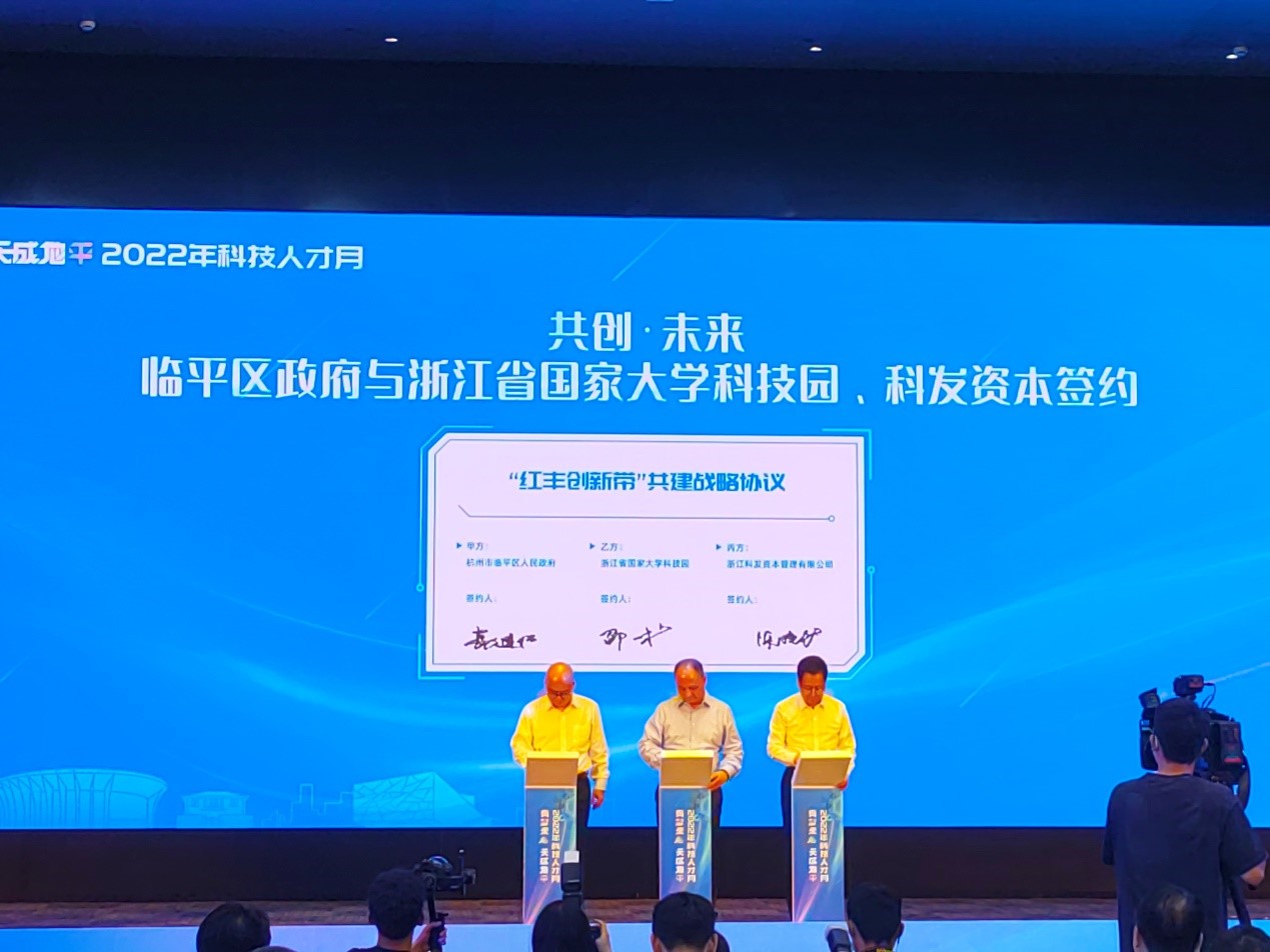 在活动现场的签约仪式上,浙江省国家大学科技园总经理邵林、科发资本董事长陈晓锋共同与临平区经济开发区管委会主任葛建伟签约,共建“红丰创新带”。浙江省国家大学科技园牵手科发资本,以杭州数字港为空间载体,通过“科创+校企+资本”全面合作的模式,在基金孵化、大学合作、双招双引和产业服务等方面深度合作,以基金撬动优质项目落地,以科创带动产业蓬勃发展,致力于打造“红丰创新带”标杆项目。