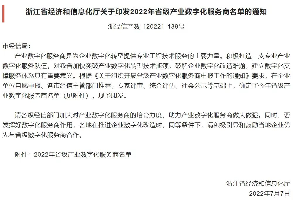 浙江省经济和信息化厅开展省级产业数字化服务商申报工作,旨在加快产业数字化与数字产业化发展,培育一批工业数字化服务机构,支撑并推动全省产业数字化改造。