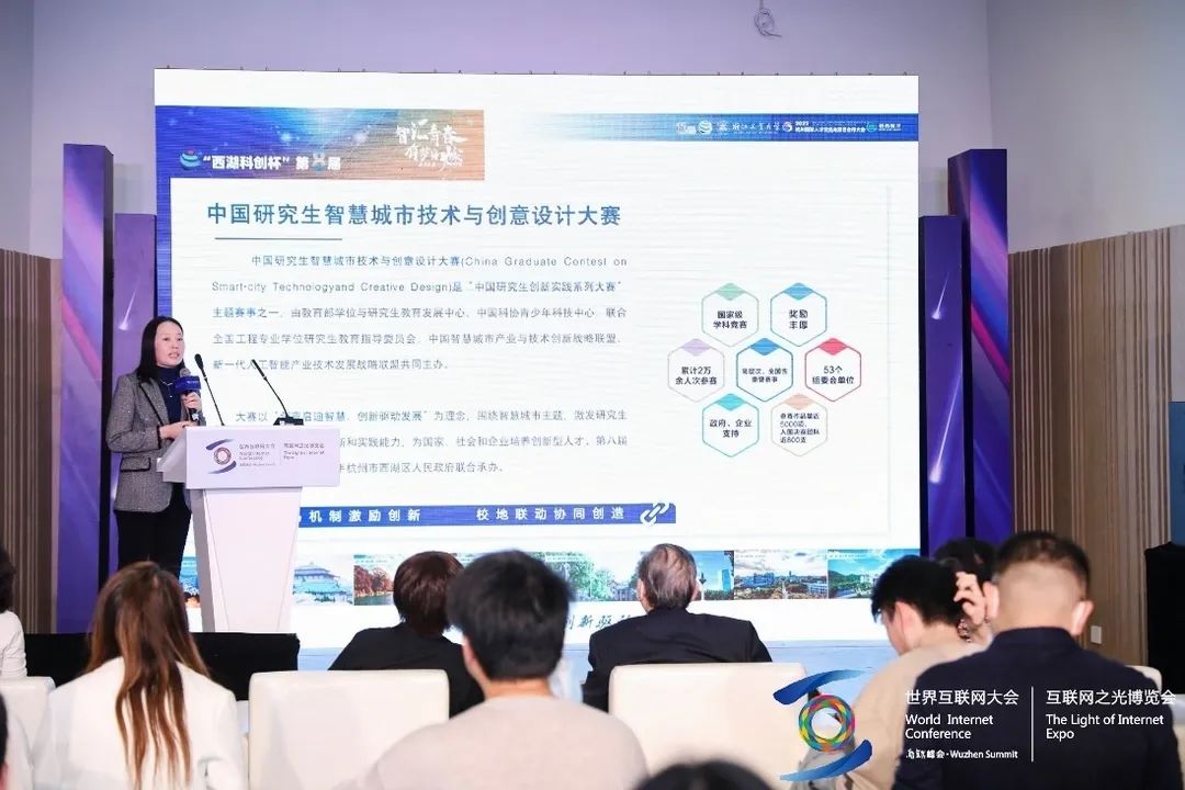 2022年世界互联网大会“互联网之光”博览会11月8日至11日在浙江乌镇举行。博览会以“共建网络世界共创数字未来”为主题,吸引了来自40个国家和地区的415家企业和机构,以线下线上结合的方式,参与展示人工智能、大数据、网络安全等领域的最新技术产品。11月10日,“西湖科创杯”第八届中国研究生智慧城市技术与创意设计大赛赛题热度榜在大会上发布,发布会紧扣智慧城市主题,就大赛概况和赛事报名情况做了说明,现场反应热烈。