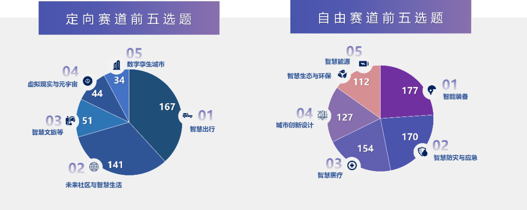 本届大赛分为定向赛道和自由赛道两个赛道。其中,自由赛道联合浙江省国家大学科技园等单位首次推出了赛马制赛题,由企业出题,采用揭榜比拼的形式,解决企业的实际难题。定向赛道中,智慧出行和未来社区位列赛题热度榜前二。自由赛道中,智能装备、智慧防灾和智慧医疗的选题较为平均,位居赛题热度榜前三甲。