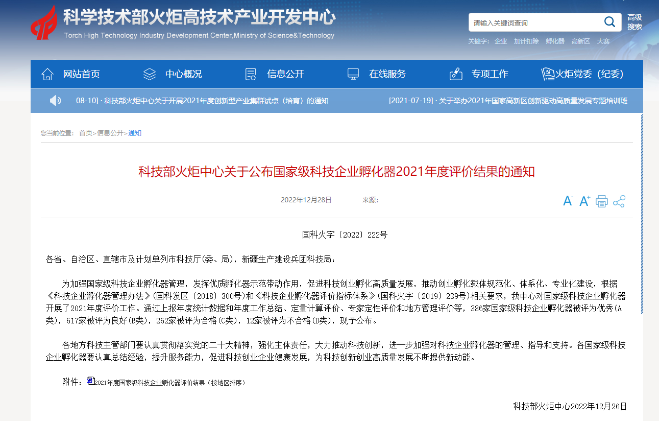 近日,科技部火炬中心关于国家级科技企业孵化器2021年度的评价结果新鲜出炉。通过数据和总结上报、定量计算评价、专家定性评价和地方管理评价等各项程序,386家国家级科技企业孵化器被评为优秀(A类),617家被评为良好(B类),262家被评为合格(C类),12家被评为不合格(D类)。浙江省21家国家级科技企业孵化器获评优秀(A类)。其中,园区运作主体浙江高校科技园发展有限公司在年度评价中获得优秀(A类)的成绩,这是科技园在七年考核中第六次获评优秀(A类)。