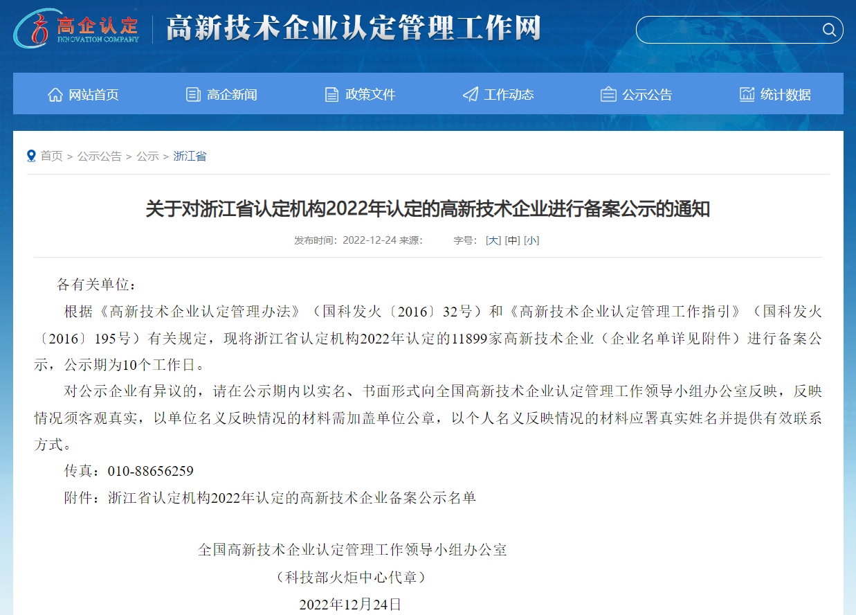 近日,全国高新技术企业认定管理工作领导小组办公室发布了《关于对浙江省认定机构2022年认定的高新技术企业进行备案公示的通知》。