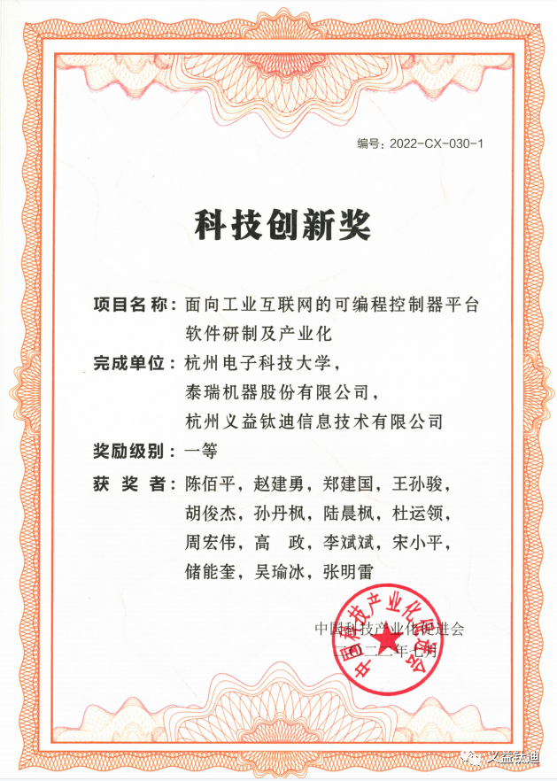 近日,中国科技产业化促进会发布了关于第三届科学技术奖励的决定。科技园企业杭州义益钛迪信息技术有限公司参与研发的《面向工业互联网的可编程控制器平台软件研制及产业化》项目荣获中国科技产业化促进会科技创新奖一等奖。