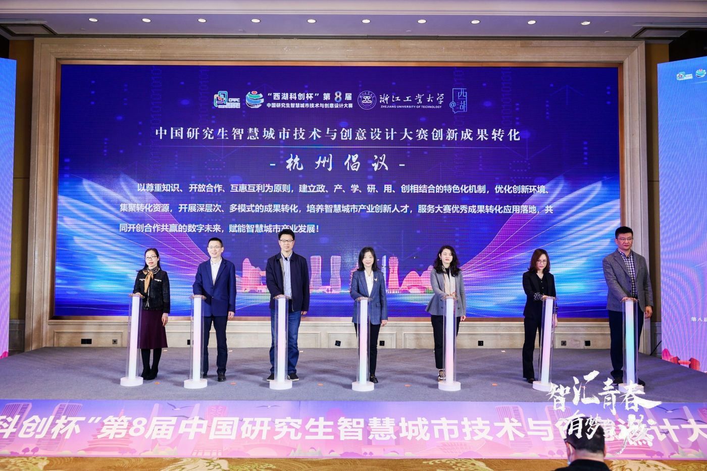 开幕式期间,由杭州市高层次人才发展服务中心、浙江特色化软件学院、杭州市西湖区科学技术局、浙江省国家大学科技园、浙江工业大学研究生院、莫干山研究院、工程设计集团、浙江省智慧城市促进会等单位在现场成立智慧城市创新成果转化基地并联合发起杭州倡议:以尊重知识、开放合作、互惠互利为原则,建立政、产、学、研、用、创相结合的特色化机制,优化创新环境、集聚转化资源,开展深层次、多模式的成果转化,培养智慧城市产业创新人才,服务大赛优秀成果转化应用落地,同开创合作共赢的数字未来,赋能智慧城市产业发展。